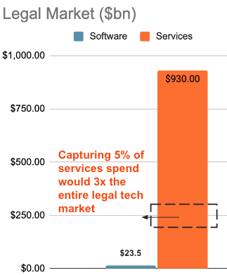 As highlighted above, the legal tech market is promising holistically but small when you start to slice it. However, when you look at the legal services market, the numbers trump any SaaS TAMs. If startups companies can access this services spend whilst maintaining software-like margins, there’s a lot of reason to be excited. We’ve seen many examples of this: