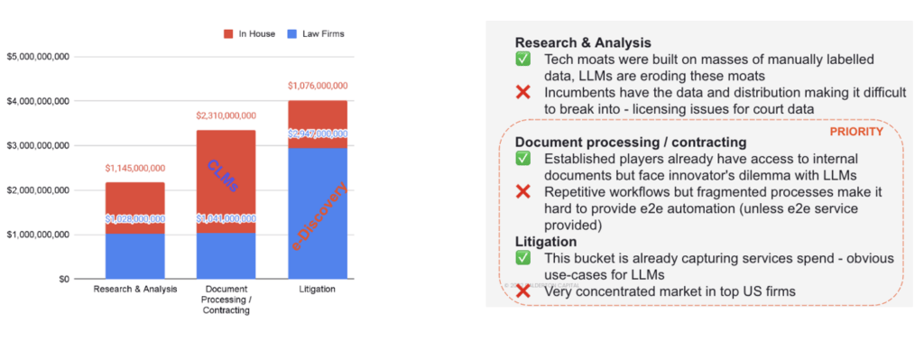 Earlier this year, we decided to dig into this trend on a deeper level – and interestingly, it became immediately obvious that there was a distinct lack of consensus in this category, relative to other segments we’ve looked into. We spoke to many smart people (lawyers, operators, buyers and sellers of legal tech, investors and founders) and everyone was very split on many core questions, such as: Should you focus on in-house or legal-firms? Are off-the-shelf models sufficiently accurate? Is the market big enough for venture-scale outcomes?