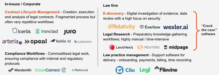 e-Discovery is “a digital investigation focused on finding evidence in emails, business communications and other electronic data for use in litigation”. i.e. it’s the process of surfacing evidence for legal arguments – there’s no legal “reasoning” required, just pure fact finding. Due to the “low value” nature of this work, it’s often outsourced resulting in massive legacy [tech-enabled] services companies in this category such as Relativity and Epiq.