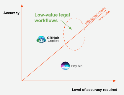 Having spoken to many lawyers in many segments – there’s no denying that off-the-shelf models (especially post GPT-4) are able to accomplish low value legal workflows (e.g. drafting summary memos, NDA review, service agreement review) – resulting in a 10x efficiency gain in these workflows.
